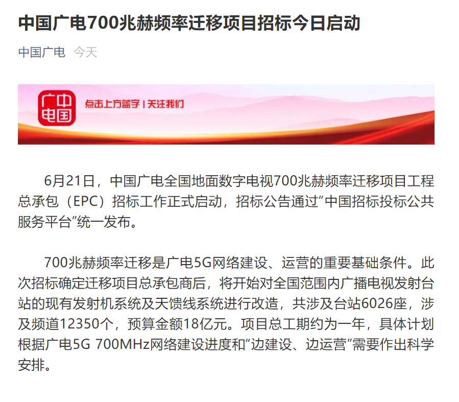 6月21日,中國廣電全國地面數(shù)字電視700兆赫頻率遷移項目工程總承包(EPC)招標(biāo)工作正式啟動,招標(biāo)公告通過“中國招標(biāo)投標(biāo)公共服務(wù)平臺”統(tǒng)一發(fā)布。