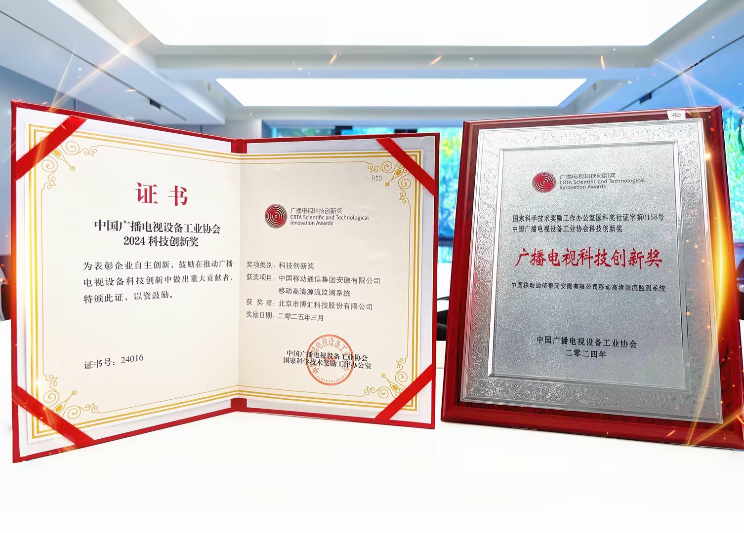 經國家科學技術獎勵工作辦公室批準設立,由中國廣播電視設備工業協會承辦的2024科技創新獎(國科獎社證字第0158號)重磅揭曉,博匯科技為中國移動通信集團安徽有限公司定制開發的移動高清源流監測系統項目榮膺「廣播電視科技創新獎」。