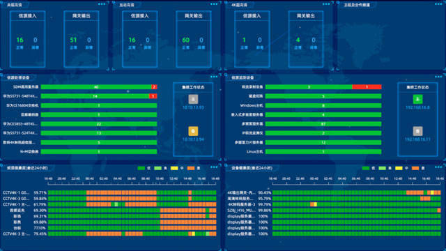 利用數(shù)字孿生技術(shù)對新媒體播控平臺的業(yè)務(wù)流程、視音頻內(nèi)容等播出要素,系統(tǒng)設(shè)備、機(jī)房機(jī)架等生產(chǎn)要素,溫濕度、煙感、水浸、電力、安防等環(huán)境因素進(jìn)行綜合采集監(jiān)測呈現(xiàn),提供最直觀的管理窗口。
